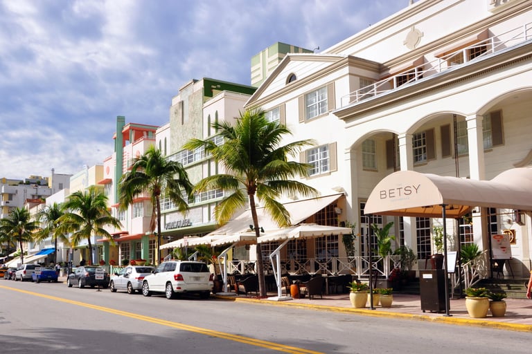 📸 Camina por la Ocean Drive, con sus históricos edificios Art Deco, autos clásicos y terrazas llenas de vida. Cada esquina parece sacada de una película.